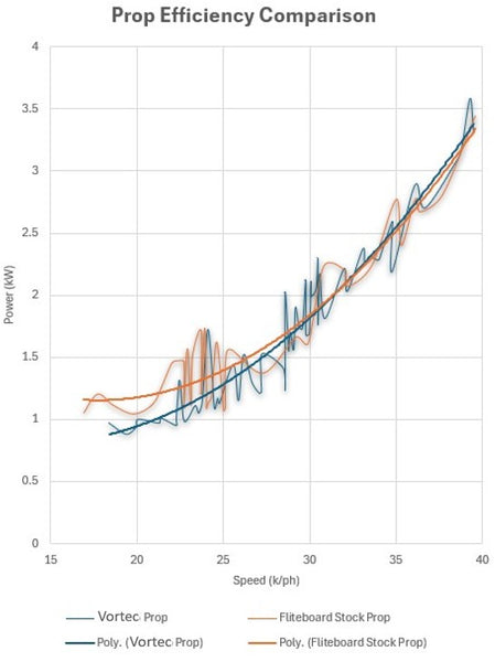 Derived from our D25 propeller debuted at the Dubai race, this new design delivers great performance. The efficiency curve shown compares it directly with the stock Fliteboard propeller.